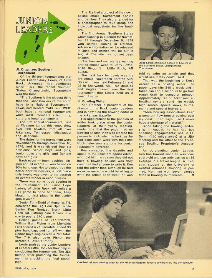 The group earned enough favor with the adult bowlers in the area that Lewis was elected the secretary-treasurer of the Greater Little Rock Junior Bowling Association in August 1978. He was only the second current youth bowler to hold the position.